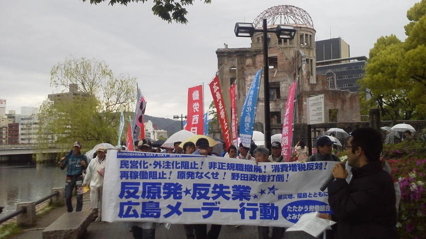 昨年の5・15闘争は連合などの体制内労組指導部が「3・11」後「政治休戦」「自粛」というなかで、平和行進の全国動員を取りやめる中での5・15でした。それから1年。沖縄の人々も私たちもこの1年間の攻防を通じて「基地問題も原発問題も全く同じ問題」ということが極めて鮮明になって「フクシマの怒りと一緒に基地も原発もいらない」というスローガンがすべての人々のスローガンになったと思います。