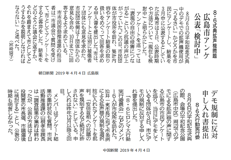 広島市が8月6日の平和祈念式典時に、デモでの拡声機使用を規制する条例をつくろうとアンケートを実施していることに対して、8・6ヒロシマ大行動実行委員会が4月3日に申し入れ行動を行いました。アンケート集約の件数など回答結果について明らかにするよう申し入れたところ、広島市は、「アンケートの集約は終了しているが、アンケート結果の発表の時期ではないので何も公表できない」と、アンケート結果の隠蔽に必死でした。広島市は、回答数すら明らかにできないほどデタラメなやり方で、安倍政権による改憲・戦争に反対の声を押しつぶそうとしています。改憲・戦争絶対反対の声をさらに大きくしていきましょう!